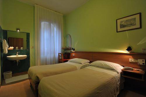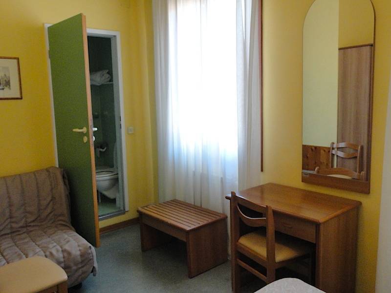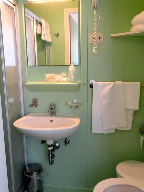All but six of the rooms have private bathrooms, most of which are period pieces in themselves: 1970s-era green tile and Formica, outfitted with a shower and hairdryer. They’re dated but in great shape. The six rooms without facilities are cheaper, have their own sinks and share spotless baths in the hallway (three rooms share each bathroom, per floor).